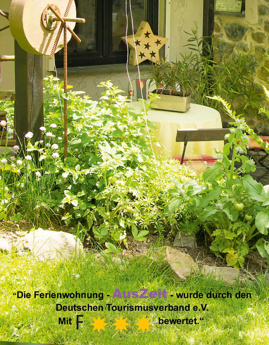 Die Ferienwohnung „AusZeit“ ist Senioren und Behindertengerecht. Die Ferienwohnung „AusZeit“ hat einen separaten, ebenerdigen Eingang mit separatem Grill- und Sitzplatz. Der Parkplatz befindet sich im Hof.